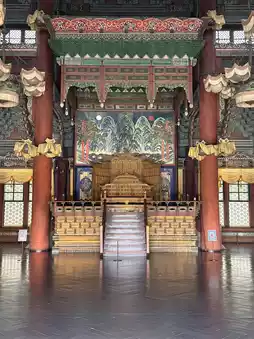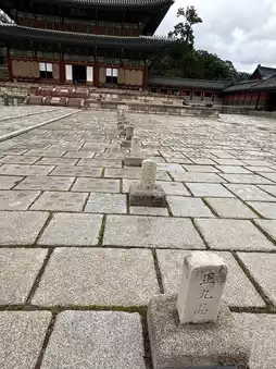 Through the yellow patterned lattice windows, the light, softened by the Korean paper, became a warm golden color. Inside the main hall, behind the throne was the "Sun, Moon, and Five Peaks": the sun and moon stand apart, protected by mountains and rivers. Thus, the throne is not merely elevated, but upheld by the cosmic order. Returning to the square, a row of official rank stones lay on the ground, from "Jeongjiu" all the way to "Jeongil," the ritual system precisely carved into the cracks of the stones. On either side of the staircase, open-mouthed Xiezhi (xiezhi) swallowed and exhaled the wind—they distinguished right from wrong and protected the law. Beside the moon platform, silent copper water vats used water to control fire, safeguarding the wooden structure.