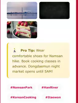 🚶 Pro Tip: Wear comfortable shoes for Namsan hike. Book cooking classes in advance. Dongdaemun night market opens until 5AM!