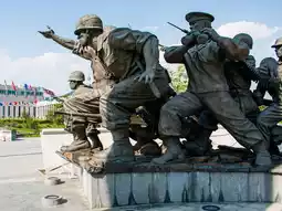 The outdoor memorial plaza includes serene elements like gardens, an artificial waterfall, and the striking Statue of Brothers—an emotional sculpture depicting two brothers, one South Korean soldier and one North Korean soldier, meeting on the battlefield, symbolizing separation and hope for reconciliation. Names of the fallen are inscribed on marble monuments.