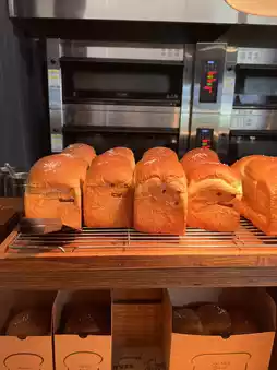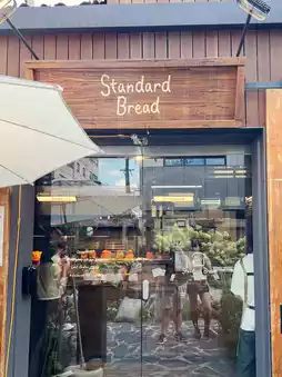 The photos you provided matched my experience: outside the entrance, a small garden and wooden pier, white parasols, and meticulously layered plantings create a small courtyard in the city. Pushing the door open, to the right is the baking area and display racks, rows of square breads like little building blocks. The wooden sign "Standard Bread" on the door lintel feels handmade, and through the transparent display window, you can see the chef shaping and baking the bread. The air is filled with the aroma of butter and baking.