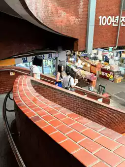 ✔ Head up to the second-floor terrace for a panoramic view of Gwangjang Market and the colorful wall mural with “Starbucks” written in Korean — perfect for photos 🌈