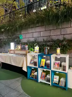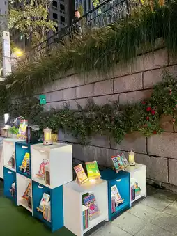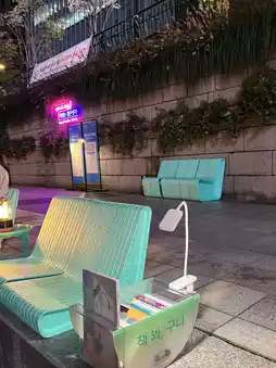 Visiting Cheonggyecheon at night, I was struck by the sight of a spectacle filled with reading and reflection. The water's edge was softly lit, and people were sitting on chairs, chatting or reading, enjoying a leisurely time. 📘
