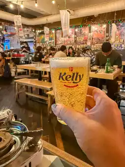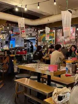 The interior is reminiscent of a Japanese izakaya, with retro-cut neon signs and posters.