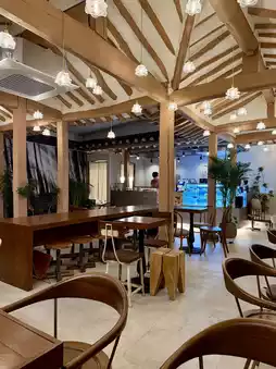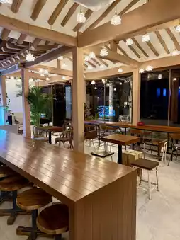 The pillars still bear traces of the hanok renovation, adding to the charm.