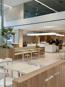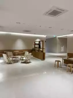 Located on the first floor of the building, it's glass-walled and has an open atrium extending to the second floor, creating a sense of openness. It's also very spacious and has luxurious seating.