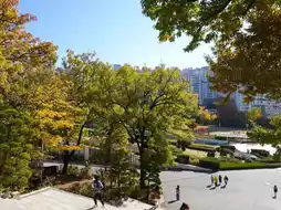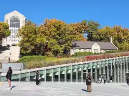 From late October to early November, the atmosphere becomes warm and romantic. The main walkway from the front gate to the academic buildings is lined with trees on both sides. The Ewha Campus Complex (ECC Building), a modern glass structure embedded in the hillside, becomes a popular photo spot where the autumn leaves contrast beautifully with the architecture 📸.