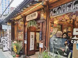 If you love getting lost in beautiful urban mazes, Ikseon-dong is your spot. The alleys are incredibly narrow—just wide enough for two people to pass comfortably—which creates an intimate and almost clandestine atmosphere that is perfect for exploration. Every turn reveals a new shop, a hidden restaurant, or a stunning photo opportunity. We noticed several vintage photo studios offering costume rentals, which really added to the area's nostalgic, Gaehwagi era charm. Even without renting a traditional dress, the warm, low lighting, the intricate woodwork on the doors, and the simple gray tiled roofs are instant, unique photo backdrops. It never feels overwhelming; instead, it feels like an exclusive neighborhood that just happens to be filled with amazing bars and restaurants. It is an essential stop for anyone wanting to capture Seoul's unique blend of past and present street life, especially for travel bloggers and Instagram enthusiasts.