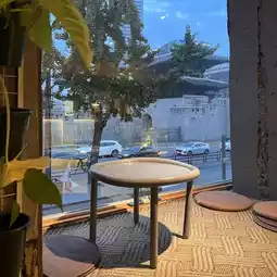 There's a cafe surrounded by greenery where you can relax while looking out at Heunginjimun.