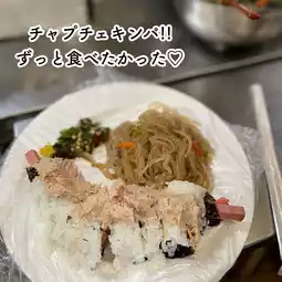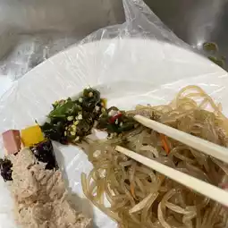 Once it's rolled, pass the plate to the person next to you, arrange the japchae on it, and it's done☺️🤍