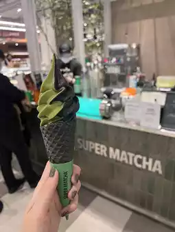 I tried the ice cream, and the green part is matcha and the black part is coconut, which was a new combination!