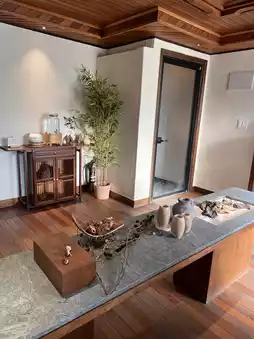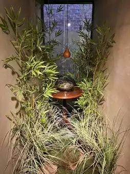 Water flows from bamboo and bamboo tubes, creating a healing space.