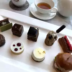 A very nice plate with many types of cakes and sweets in easy-to-eat sizes♩
