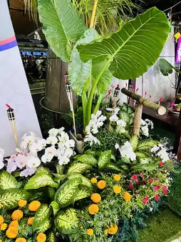 Towering coconut trees frame the setup, while vibrant spring flora—orchids, monstera, chrysanthemums, lilies, and Mexican petunias—bloom around the deck, creating a lush, celebratory ambiance. This picturesque blend of cultural heritage and seasonal beauty offers travelers a delightful welcome, embodying the joy and togetherness of Raya with a refreshing floral twist.