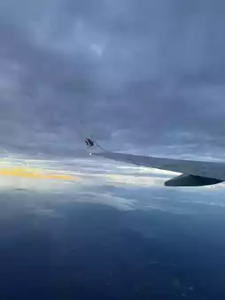 As the sun sets on the horizon, it casts brilliant streaks of color across the sky—amber, rose, gold, and violet. The clouds catch the light in layers: their tops gleam with molten warmth while their undersides melt into cool shadows. The airplane’s wing might cut through the scene, catching the sunset’s reflection in a sleek, metallic shimmer.