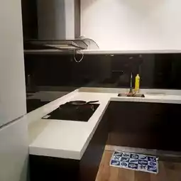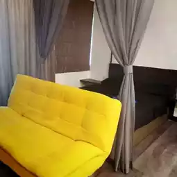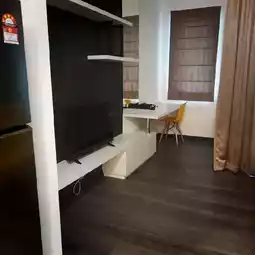 Room is. spacious with kitchen stuff, refrigerator, washing machine, all the eating stuff.