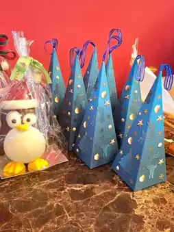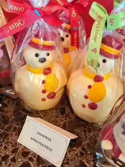 Picture a big, vibrant red bus decked out with Christmas ornaments, surrounded by delicious holiday treats for sale.