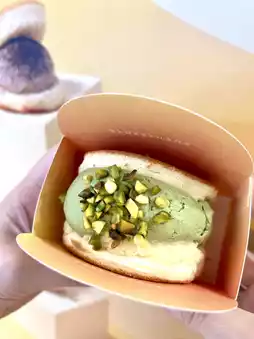 As a pistachio lover, I fell in love with this at first sight 😻 Thick soufflé pancakes are full of air, sandwiched with oversized balls of pistachio 💚 The cream is super smooth, the nutty aroma is rich and not too sweet, the top is sprinkled with pistachio crumbs to increase the crunchy taste, every bite is a happy taste 😋 The pancakes themselves are prominently eggy, with a slight caramel aroma, and the rich pistachio cream is surprisingly greasy, 👍 will not try the whole thing