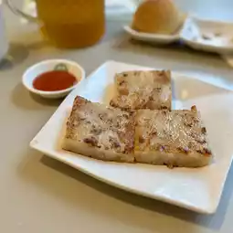 This is radish cake. It is crispy and fragrant on the outside, and the inside has a pleasant fluffy texture. It has a simple taste that allows you to fully enjoy the flavor of radish.