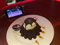 There’s vanilla ice cream with a chocolate hat on top of the moist brownie, and inside there’s also dripping chocolate 🍫🍫 The best!!!