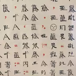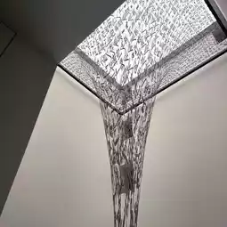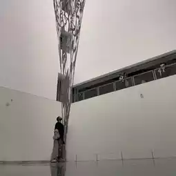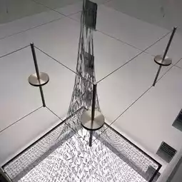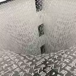 Xu Bing tailor made installation is installed in the main hallway of the museum which is hanging 30 feet from the ceiling and is pulled downwards by gravity with distorted chinese pinyin letters reflected by the huge mirror placed at the bottom of the installation showing the mutual penetration between the work and the space with a shocking visual effect 🤩😍