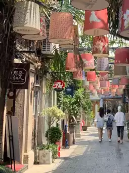 It's very colorful and bright with greeneries hugging old buildings. Many shops offer free tasting of candies tea ice cream etc.