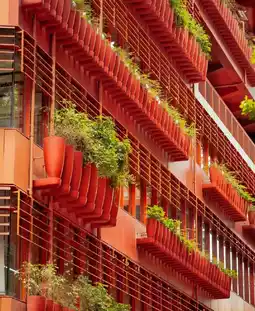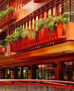The complementarity formed by face-to-face commerce, office activities under the roof, and restaurants creates a warm and naturally lively street. The sunshade louvers cast shadows, and the huge flower pots surround the windows, giving a sense of mystery to the existence here, and protecting them by creating a variety of shrubs and colorful flowers that change with the seasons.