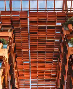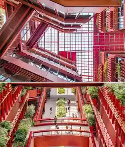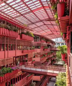 The architect hopes to create a unique and unpredictable walking experience. While perfectly embedding the building into the local urban texture, the beige facade defines the two entrances of Madang Road and Danshui Road. Citizens can glimpse the unique light and color inside, as well as the lush vegetation.