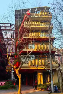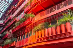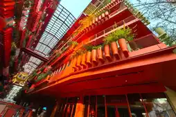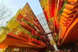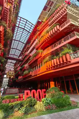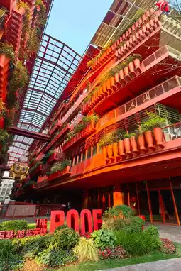 CIFI's Landmark continues the cultural foundation of Xintiandi, integrates light and shadow and natural elements, uses collision techniques such as red and green, inside and outside, new and old, the inner street uses bold Danxia red, creating a huge collection-level art building, panoramic skylight roof, making it possible to bask in the sun during the day and watch the stars at night, it not only provides shelter for the street, but also introduces natural light, making the space more transparent and unique, about 2500 flower pots of vertical greening, constitute a rare green facade in Shanghai, with the change of the four seasons, the color of the building facade also changes.