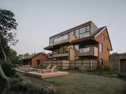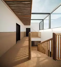 In the main building, a total of 552 square meters of space mainly provides accommodation functions. The original floor was two floors, and it was adjusted to three floors in terms of feasibility. The original divided space was too small in single area, the room shape was narrow and long, and the original staircase structure position blocked the view of the national protective forest. Therefore, the position of the staircase was adjusted in the design, and it was placed in the middle position on the north side of the building to maximize the optimization of the building's movement line and visual range. At the same time, the existing protruding rectangular building structure balcony can help to meet the room area and layout requirements appropriately, achieving a balance of room quantity and size.