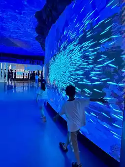 The underwater viewing tunnel at the entrance is quite shocking. There are two, one large and a small one for children to visit. There are many beautiful marine fish in the viewing tunnel, swimming around, creating a light holiday atmosphere, which is very suitable for children's study tours.