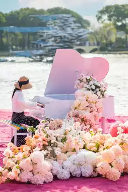 No girl can resist the pink beach, white piano, and flower boat!