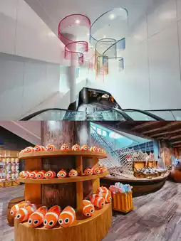 From the moment the mall elevator doors open, it feels like entering a blue underwater world, with two large sea turtles and devil fish at the entrance of the underwater tunnel, set against colorful and beautiful corals, looking particularly interesting.