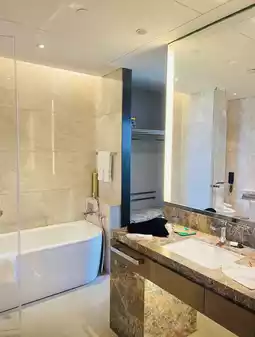 There is a bathtub🛁, equipped with a smart toilet🚽,