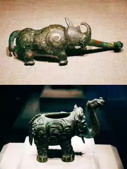 1⃣️ Shang Dynasty·Bronze Elephant Zun: Collected by Hunan Museum, unearthed from Shixingshan in Liling, Hunan, the only surviving Shang Dynasty bronze elephant zun in China, a classic example of the bronze culture of the Xiangjiang River basin. The zun is shaped like an elephant and is used as a wine vessel. The elephant's trunk is connected to the belly, allowing it to pour liquid, and there is an oval hole on the back where wine can be poured in. The vessel is decorated with patterns of dragons, wind, tigers, and beast faces, especially the phoenix and tiger patterns on the elephant's trunk.