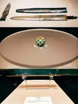 4⃣️ "Sword of King Fuchai of Wu" (arriving on September 8) and "Sword of King Luying of Yue" exhibited together. Warring States Period·"Sword of King Luying of Yue", collected by Jingzhou Museum, the sword has a double hoop round stem with concentric circle head, the guard inlaid with turquoise, and both sides of the sword guard have gold inlay inscriptions, the front reads "Yue Wang Yue Wang" (King of Yue), and the back reads "Zhe Zhi (Zhuji) Yu Ying", Yu Ying being Luying. According to the "Bamboo Annals", Luying was the son of King Goujian of Yue. This sword was found in the Chu region and may have been due to reasons such as war, diplomatic missions, etc.