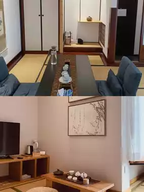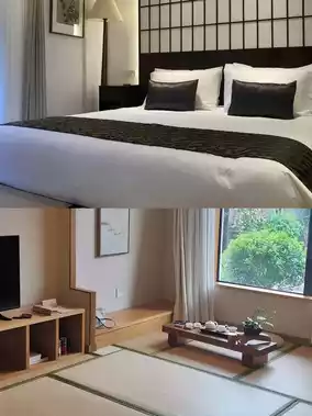 🛏️ The room layout is all in Japanese style, and extra beds can be added in the living room of the tatami rooms. The toiletries all match the hotel's style and use Japanese brands, and instead of following trends with a Dyson hairdryer, even the kettle is made in Japan. The washroom and bathroom are separated at opposite ends of the room, not interfering with simultaneous use. The bathroom is equipped with a small chair, convenient for bathing children.