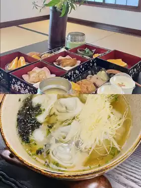🥣 Breakfast can be eaten in the public area of the lobby or can be delivered to the room at a scheduled time with the butler. There is a wide variety of dishes packed in Japanese-style boxes, and although each portion is not large, the variety is plentiful, making it hard for one person to finish. The food and drinks in the room's fridge are free, including beer.