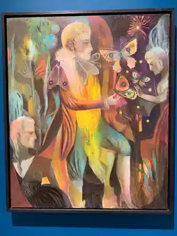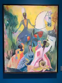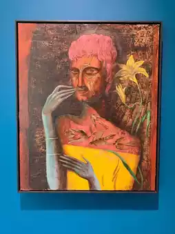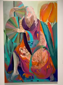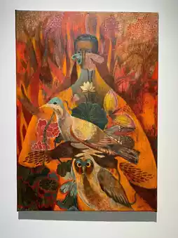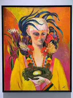 The artist integrates his experiences into his works, expressing African traditional art, Indian temple art, South American folklore, and elements of pop culture in novel ways, giving his works a unique recognizability. In his paintings, we can also find many animals, plants, and ancient symbols. The artist skillfully weaves them into his works, creating an art space filled with a retro vibe.