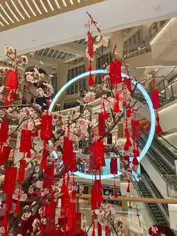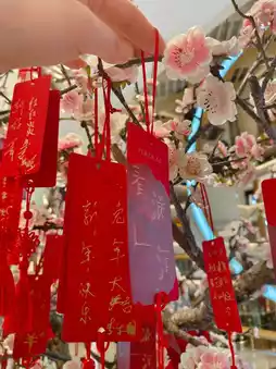 The interactive New Year blessing installation on the second floor of the mall combines beautiful images such as mountains, rivers, jade rabbits, and peach blossoms to present a New Year scene. Guests can receive limited edition fortune sticks, write blessing words, and hang their messages on the branches of peach trees, wishing that the new year will be better than the old year.
