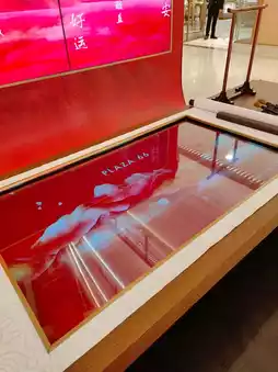 The interactive installation of red mountains and rivers in ink painting on the first floor of the mall is inspired by the ancient oriental ink painting art. Guests can draw new year fortune words on the electronic interactive screen of the installation, trace the red characters, scan the QR code to receive an exclusive greeting card with words on it, freeze the blessings and enjoy the festive season.