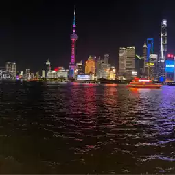 Across the Huangpu River rises the Pudong district’s futuristic skyline, including 632m Shanghai Tower and the Oriental Pearl TV Tower, with distinctive pink spheres.