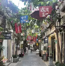 This is Tianzifang (Electronic Shop), a famous spot in Shanghai that has recently become the hottest spot among China's MZ generation. It is a place where an alley that used to be a factory has been renovated and turned into a tourist attraction. The sky between the alleys is decorated with various decorations, creating a strange atmosphere that feels like indoors even though it is outdoors. It is famous as a place where you can buy Shanghai travel souvenirs at a cheaper price than the airport, and recently, many people buy T-shirts or Tabaitu candies with a design of their choice as souvenirs. Highly recommended!!