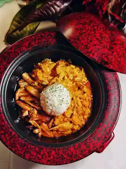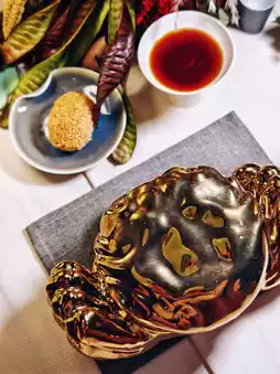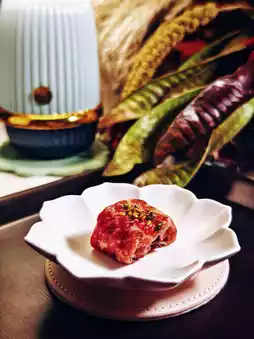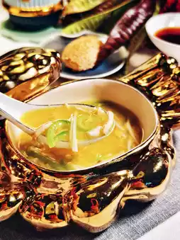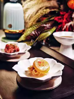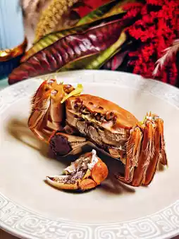 The crab roe is topped with crystal caviar, the sturdy crab claws are decorated with brilliant ginger paste, the graceful crab legs are filled with bright pepper and numbing flavors, and the carved fish peony is revealed in the wisp of smoke when the lid is opened. Wearing gorgeous. This Crab Kirin among Flowers has taken the skill of removing crabs and returning them to their original state to the extreme. It seems that every gust of wind brings the beautiful fragrance of flowers, making people intoxicated in the poetic and picturesque scene, sighing that the prosperity is like smoke.