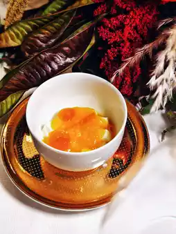 The last dish looked like a dessert pudding, but it was actually cold tofu covered with crab roe. The dazzling orange-gold is like the tenderness of this autumn embedded with golden sunshine, and like the elegance of the fallen leaves drifting in the wind.