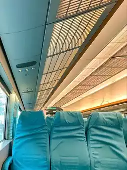 There are luggage racks on the train. When we went, there were a lot of empty seats so we could choose to sit comfortably. The train runs at a speed of 300 km per hour. It feels like riding a train in a theme park. But it runs very smoothly, like floating. It's very exciting. If I have a chance to go to Shanghai again, I will choose to fly to Pudong Airport because I want to ride the Maglev train again.