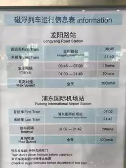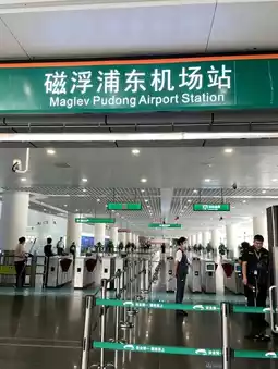 We took the Maglev Train from Longyang Road to Pudong Airport. First, we had to take the train from the city to Longyang Road Station. Look for the signs for the Maglev train station. Follow the signs and you won't get lost. Then buy a Maglev train ticket. If you show your boarding pass to the ticket seller, you will get a discount of 40 yuan. However, if you buy from the vending machine, you will get the full price. Before entering the station, you have to scan all your bags. You also have to wait before the departure time because the train doors will close 1 minute before departure.