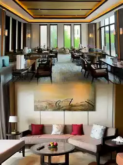 The hotel is located in the east of Chongming Island, just over an hour's drive from downtown Shanghai. It can be said to be a great place for the people of Shanghai to spend their weekends. Surrounded by Dongtan Wetland Park, Yingdong Ecological Village and other attractions, the air is fresh and the scenery is pleasant🌅. The hotel itself is like a large garden, with Chinese-style architecture and natural landscapes perfectly integrated, as if you are in a beautiful landscape painting🖼️.