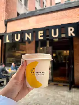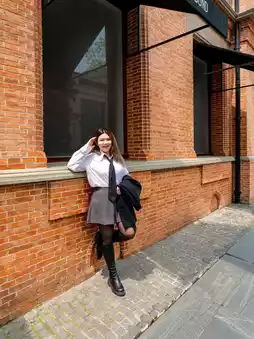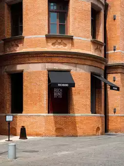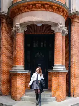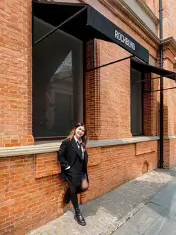 Orange brick building with a European feel Wear dark colored clothes contrasting with the color of the building