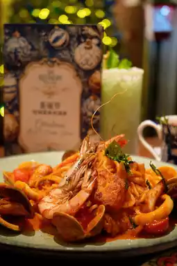 This seafood pasta is full of ingredients, including tiger prawns, salmon, clams, squid, and more. The sweet and sour tomato sauce blends into the chewy noodles, making it delicious.
