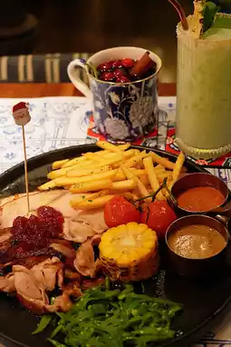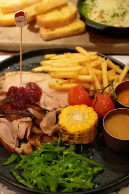 Of course, you have to have roast turkey for Christmas. The chicken is crispy on the outside and tender on the inside, served with fresh vegetables and freshly fried fries. It comes with two sauces, and I personally prefer the cranberry sauce, which is sweet.